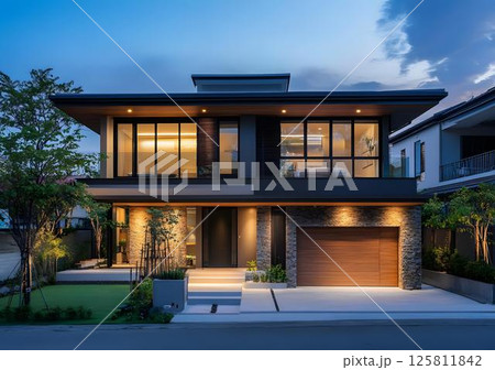 Modern Two Storey House with Stone Facade and Wooden Garage Door