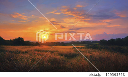 Beautiful sunset over countryside field with warm colors and peaceful atmosphere, capturing essence of nature tranquility and end of day