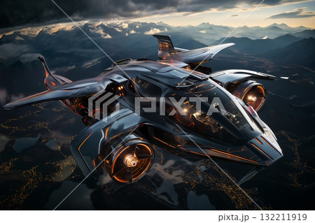 futuristic flying vehicle over the city, aerial view, cityscape, sky at sunset, aerial transportation