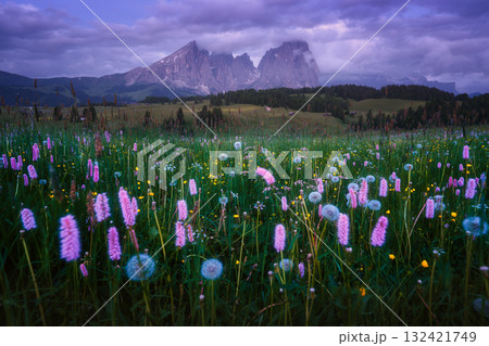 Colorful wildflowers and dandelions growing in alpine meadow