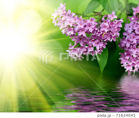 Branches of purple lilac and green leaves. Blooming branch of lilac
