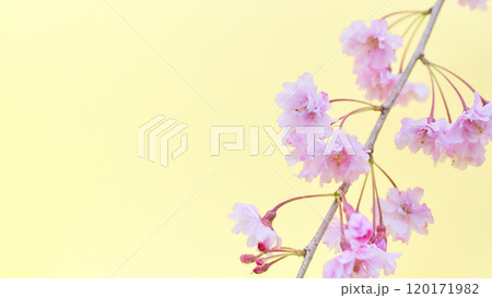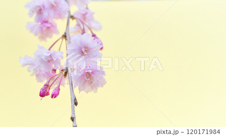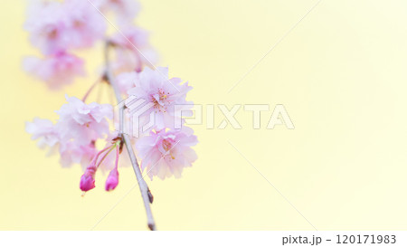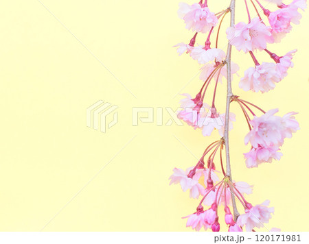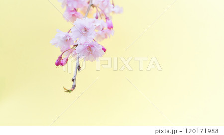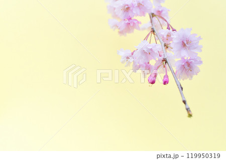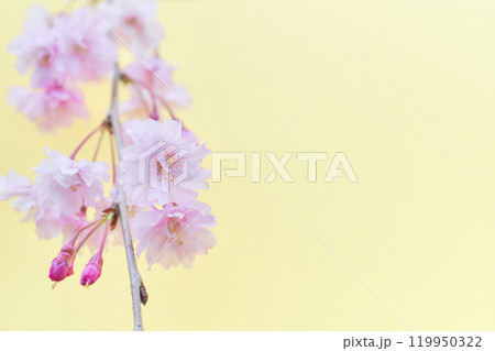 ふんわりとした枝垂れ桜の花のアップ 薄黄色背景