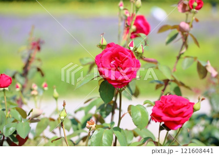赤色のバラの花「ジュビレ・デュ・プリンス・ドゥ・モナコ」