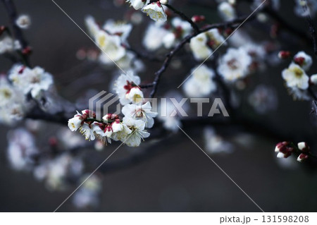 春の背景素材・花桃の一種紅白咲き分けの源平桃の花・縦位置