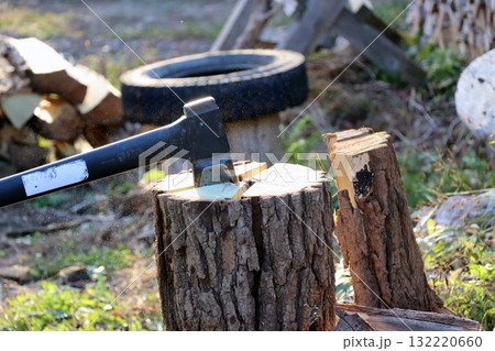 薪に刺さった古びた斧