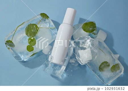 Top view of white bottle container cosmetic and frozen gotu kola leaves in ice cube decorated on blue background.Body care cosmetics with gotu kola extract formulation concept, copy space