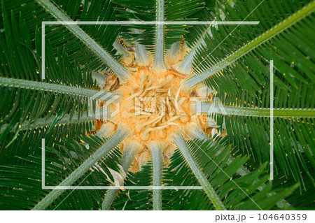 Creative layout, rosette of green palm leaves, top view, creative layout idea or flat lay for advertising card or invitation