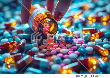 Female fingers selecting a variety of colorful pills, filling a small vial amidst pharmaceuticals. Healthcare and pharmacology concept