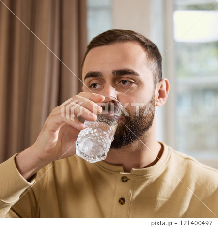 Man with cold drinks, dissolved medical preparation, effervescent tablet, to improve his physical condition.