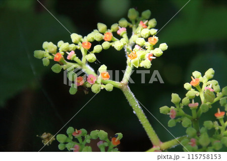 ヤブカラシの花と、その蜜を目当てによって来たアミメアリのアップ