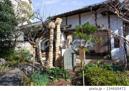 庭に飾られた正月飾りの藁ぼっち 縁起物