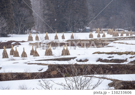 雪降る奥会津の冬景色、田んぼに並ぶ藁ぼっち(わらにお)と雪化粧した棚田の風景