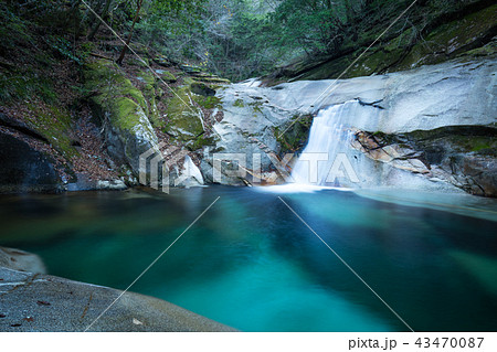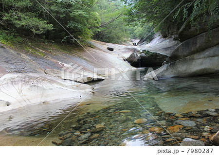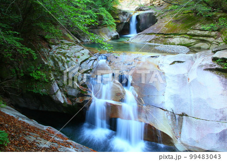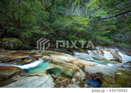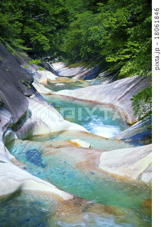 新緑の季節の藤河内渓谷 エメラルドグリーンの甌穴