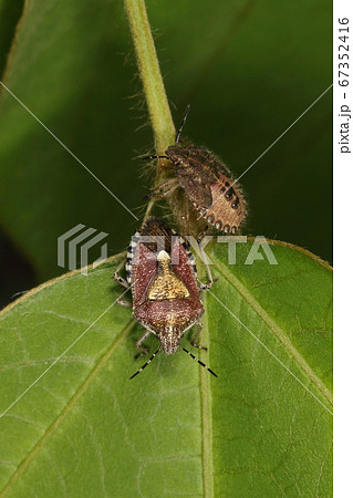 生き物 昆虫 ブチヒゲカメムシ、六月のクズの葉上。あまり似ていない親子で吸汁中