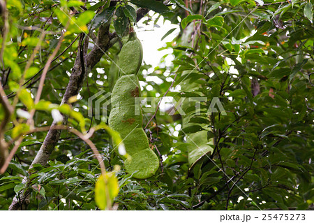 自然 植物 コウシュンモダマ、八重山の森では時に1メートルほどもあるマメが頭の上にぶら下がっています