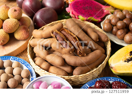 テーブルの上に美しく飾られたトロピカルフルーツの盛り合わせ