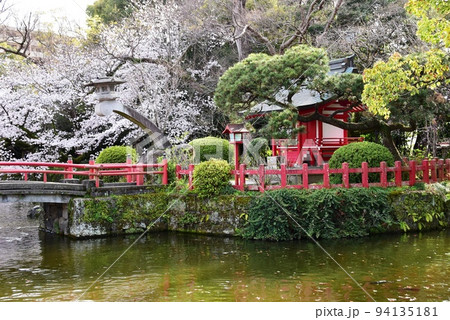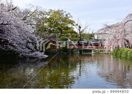 静岡県三島市 三嶋大社の厳島神社と神池と満開桜