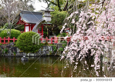静岡県三島市 三嶋大社の厳島神社と神池と枝垂れ桜