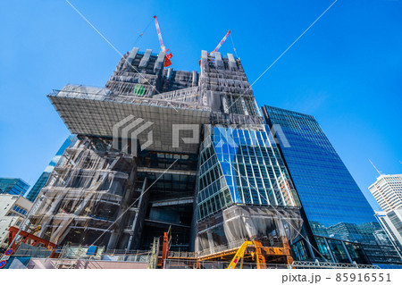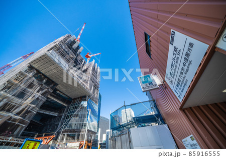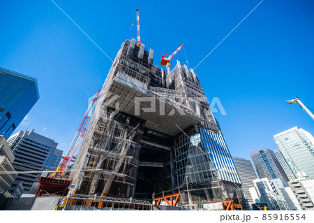日本の東京都市景観 虎ノ門ヒルズ駅や立ち上がった鉄骨などを望む