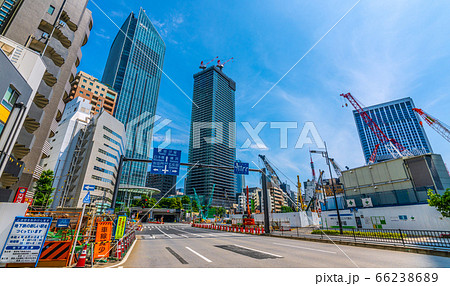 日本の東京都市景観 虎ノ門ヒルズやB2出口、虎ノ門ヒルズステーションタワーなどを望む