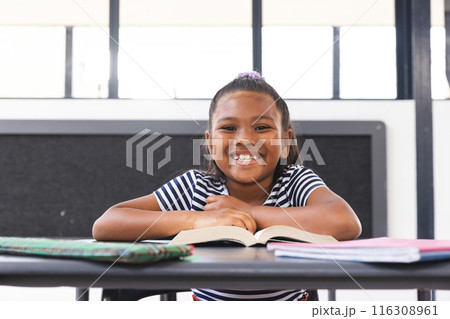 In school, young biracial girl is sitting at a desk in a classroom, reading a book