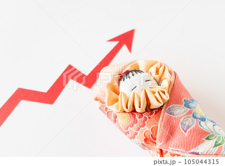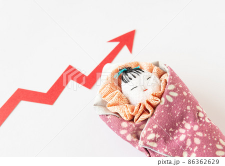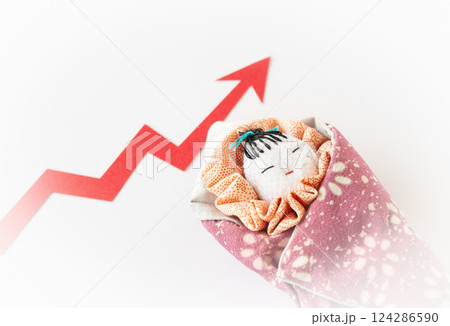 手作りの赤ちゃん人形と上昇矢印 赤ん坊 おくるみの赤ちゃん