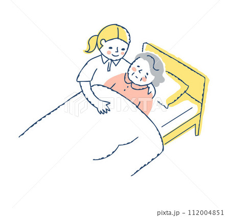 ベッドに寝ているシニア女性と介護している女性