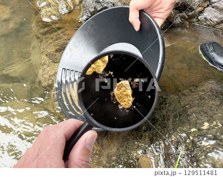 砂金採り 採れた砂金を虫メガネでクローズアップ