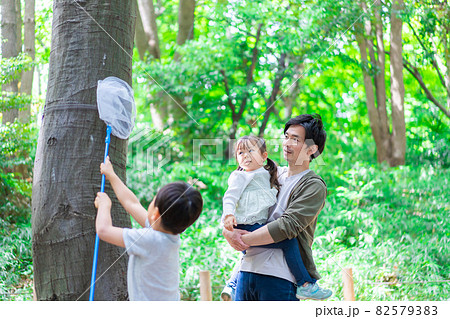 家族で夏休みの虫探し!春夏のお出かけやアウトドアレジャーのイメージ 旅行で森で遊ぶ
