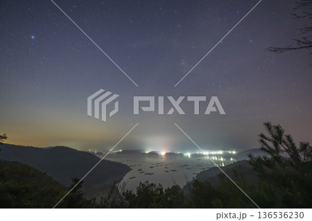 日本の岡山県瀬戸内市の虫明湾に浮かぶ春の天の川
