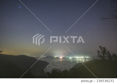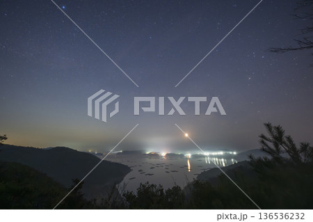 日本の岡山県瀬戸内市虫明の海に浮かぶ美しい星空
