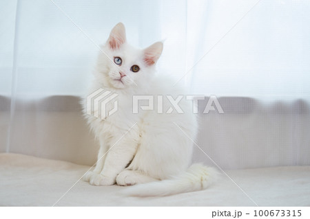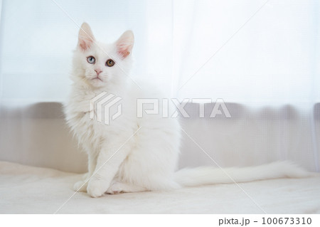 フカフカの猫ベッドに入ったメインクーンの白い仔猫