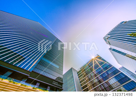 日本の横浜都市景観珍景。太陽を囲む淡いリングの不思議な光景…新高島駅前の摩天楼などを望む
