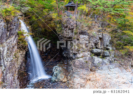 秋の龍王峡 虹見橋から見た虹見の滝と渓谷と山の紅葉