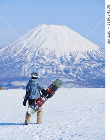 ニセコで羊蹄山をバックに楽しむスノーボーダー