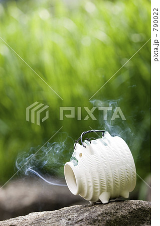 夏の背景素材・蚊遣り豚から立ち上る蚊取り線香の煙り・青バック横位置