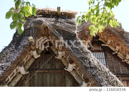 白川郷 合掌造り小屋組(屋根)の頂部 棟木とカンザシガヤ