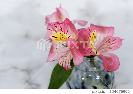 寒色のガラスの一輪挿しに挿したアルストロメリアの花(中配置)
