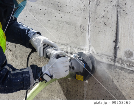 集塵サンダーでコンクリート表面の素地調整をしている様子