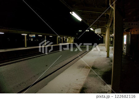 夜明け前の雪のホームの風景