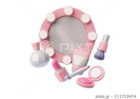 3D makeup mirror with light bulbs and beauty cosmetic products, foundation powder, blender brush, lipstick cream tube