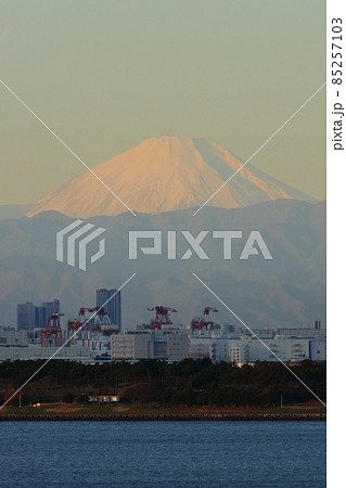 風景 富士山、冬の朝。大井埠頭あたりのガントリークレーンと丹沢山系、その向こうに少し赤い富士山
