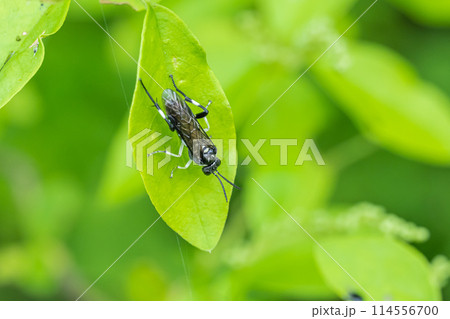 葉の上の狩り蜂 アナバチ科クロアナバチペア