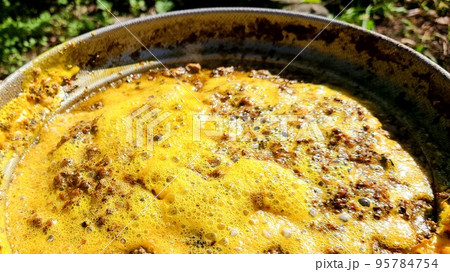ミツロウブロックの生成 巣蜜の搾りかすを熱水に溶かし込む