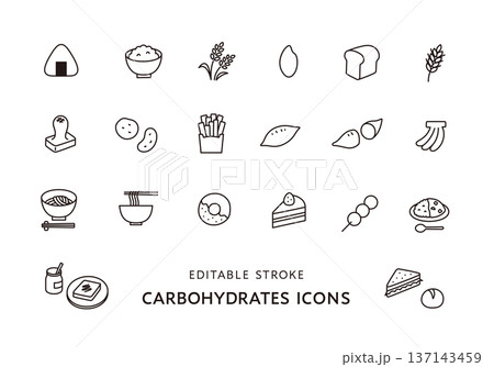 炭水化物を多く含む食品のアイコンセット(モノクロ)