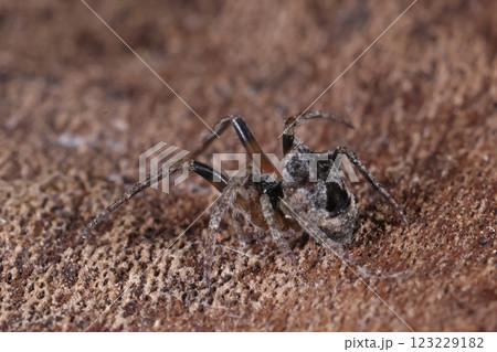 生き物 蜘蛛 ゲホウグモ、二ミリほどの幼体。腹部の模様や形には変異が多いようです