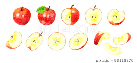 りんごの果実と半分にカットした蜜入りりんごのセット フルーツの手描き水彩イラスト素材