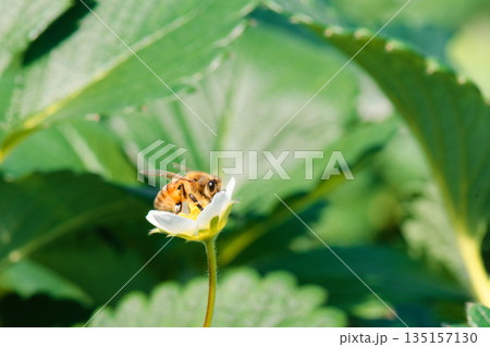 イチゴハウスで花の蜜を吸い、受粉するハチ