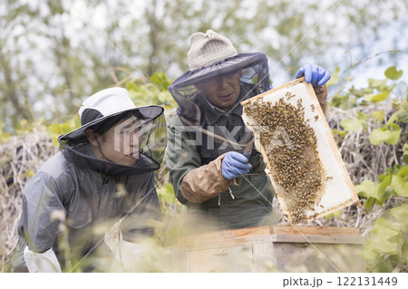養蜂イメージ 若い男性に養蜂のやり方を教えるシニア男性