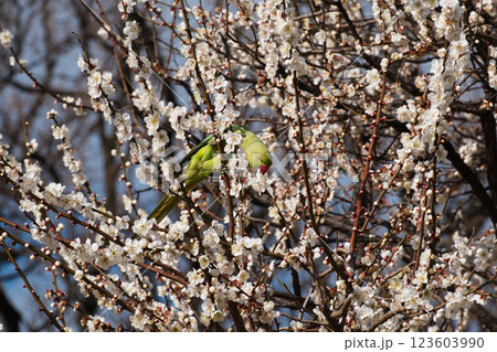 梅の花を食いちぎって蜜を吸うワカケホンセイインコ5